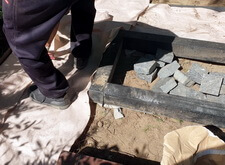 Перед тем, как закладывать участок брусчаткой, мы застелили территорию места захоронения геотекстилем, препятствующим дальнейшему прорастанию травы в швах между плитками.
