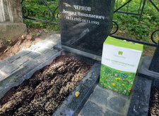Газон ещё раз засыпаем землёй, чтобы предотвратить выдувание семян ветром и ускорить процесс прорастания. Вот так выглядит окончательное состояние участка на момент завершения работ: памятники с цветниками установлены как и лавочка со столиком, землю закрывает гранитная брусчатка.