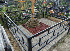 Сначала мы покрасили ограду, установили крест, положили брусчатку. Когда мы закончили укладку брусчатки пошел дождь, пришлось срочно накрыть ее пленкой. Это спасло ситуацию, если бы дождь залил брусчатку после укладки – это испортило бы работу, цемент забрызгал бы шероховатый камень, а избавиться от его следов практически невозможно.
